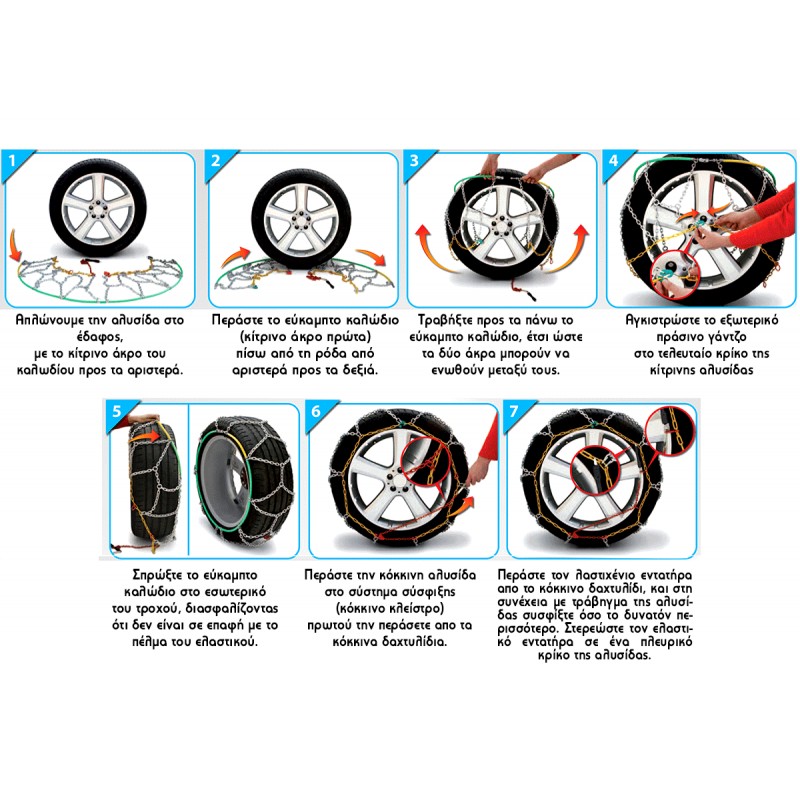 - Περιλαμβάνει: νάιλον γάντια για χρήση κατά ην εφαρμογή των αλυσίδων στους τροχούς.