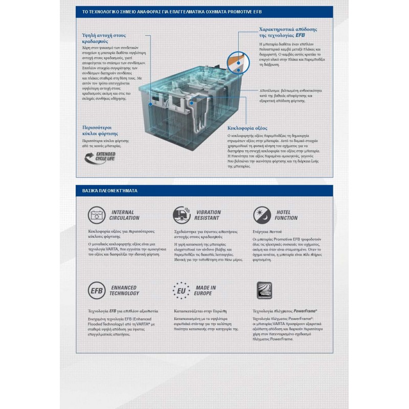 - Ενισχυμένη τεχνολογία EFB (Enhanced Flooded Technology) για επιπλέον αξιοπιστία: υψηλή απόδοση για ύψιστες επαγγελματικές απαιτήσεις